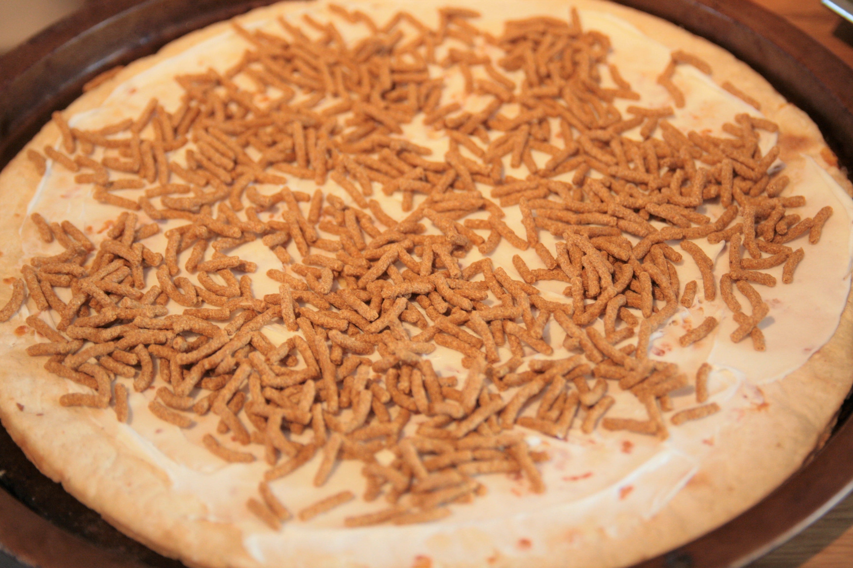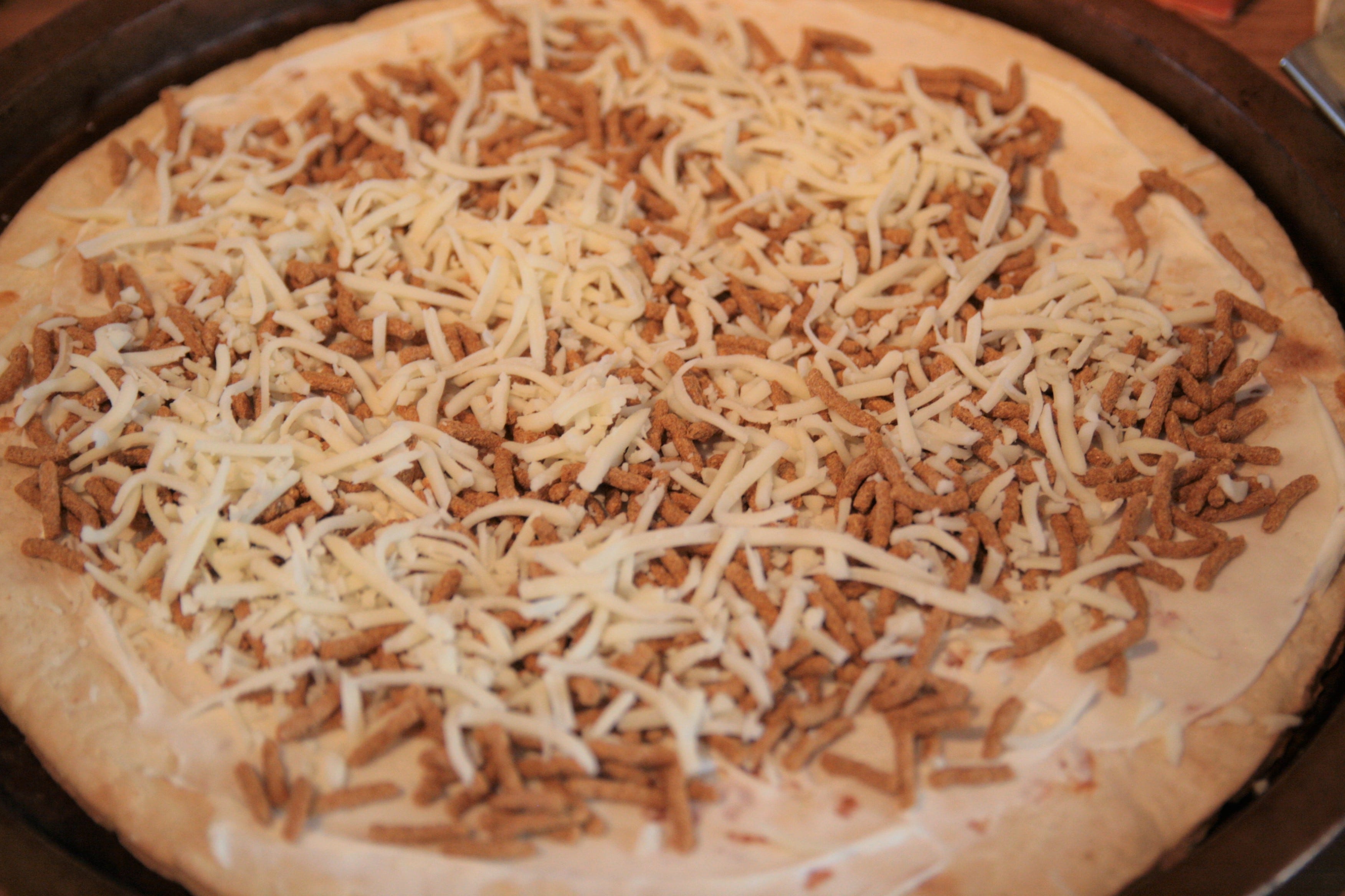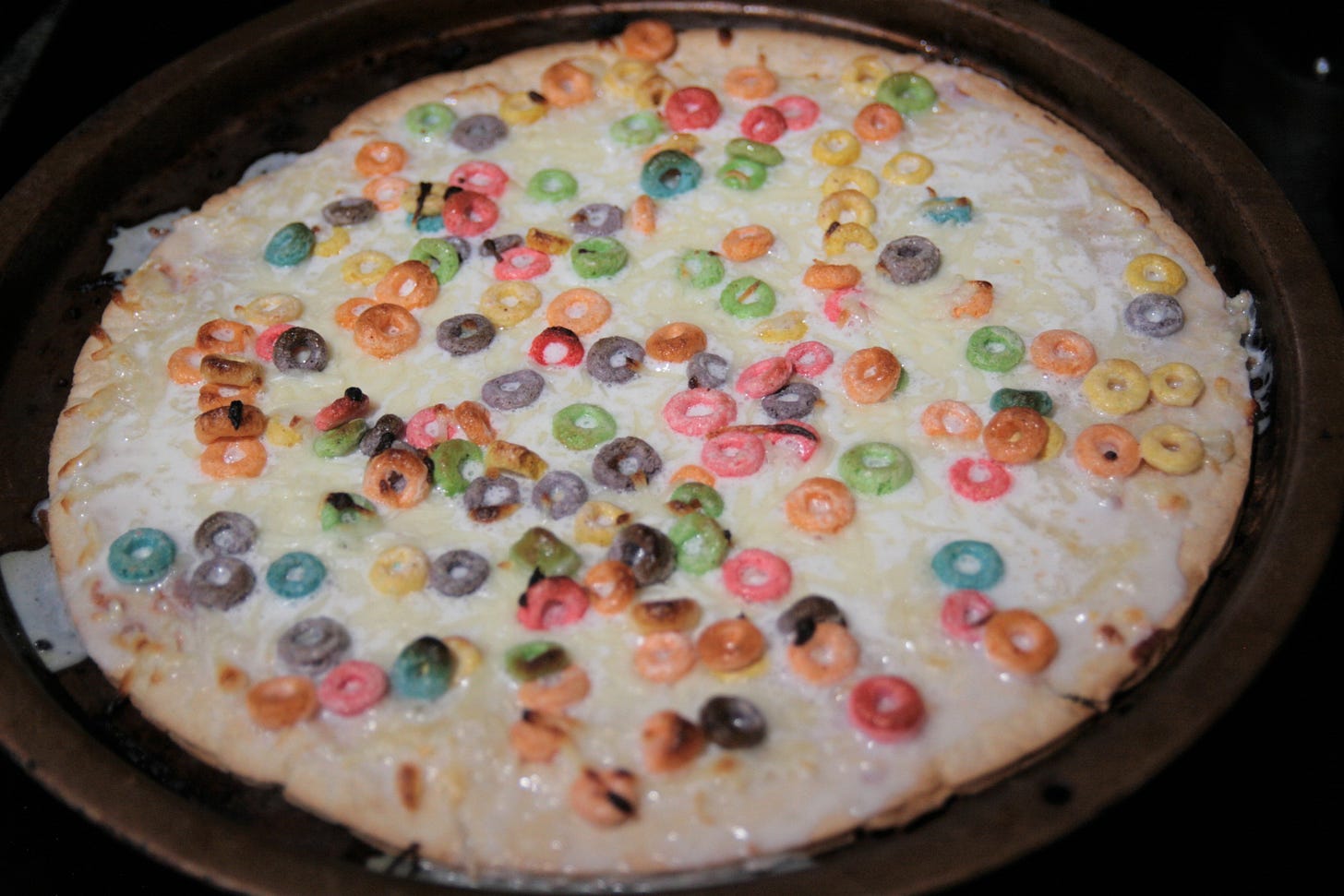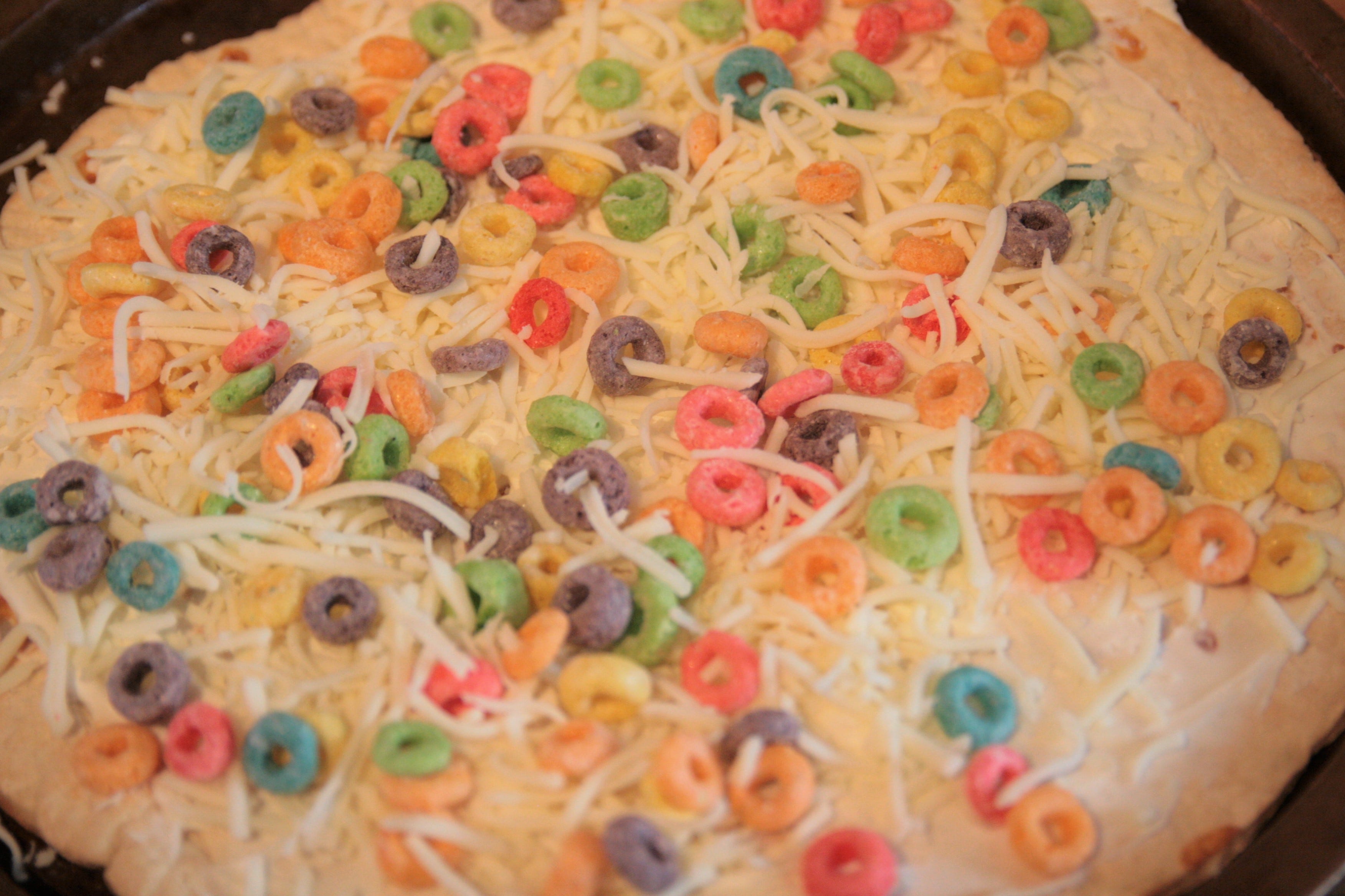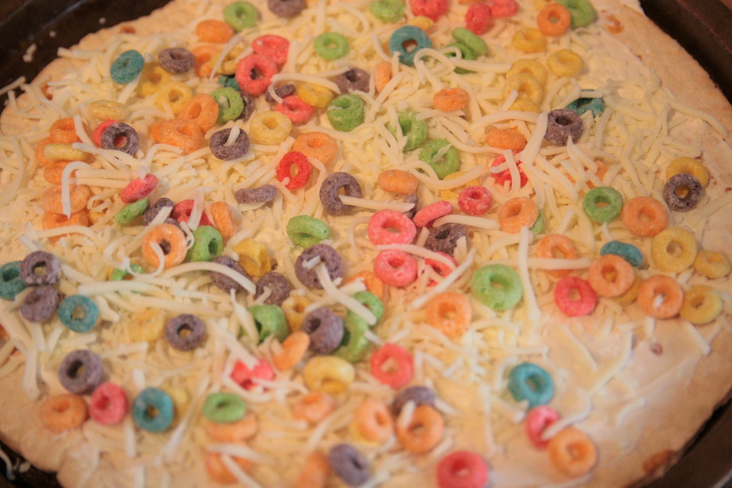 I topped the pizza crust with the last ingredients, which was plenty of mozzarella and Froot Loops cereal.
