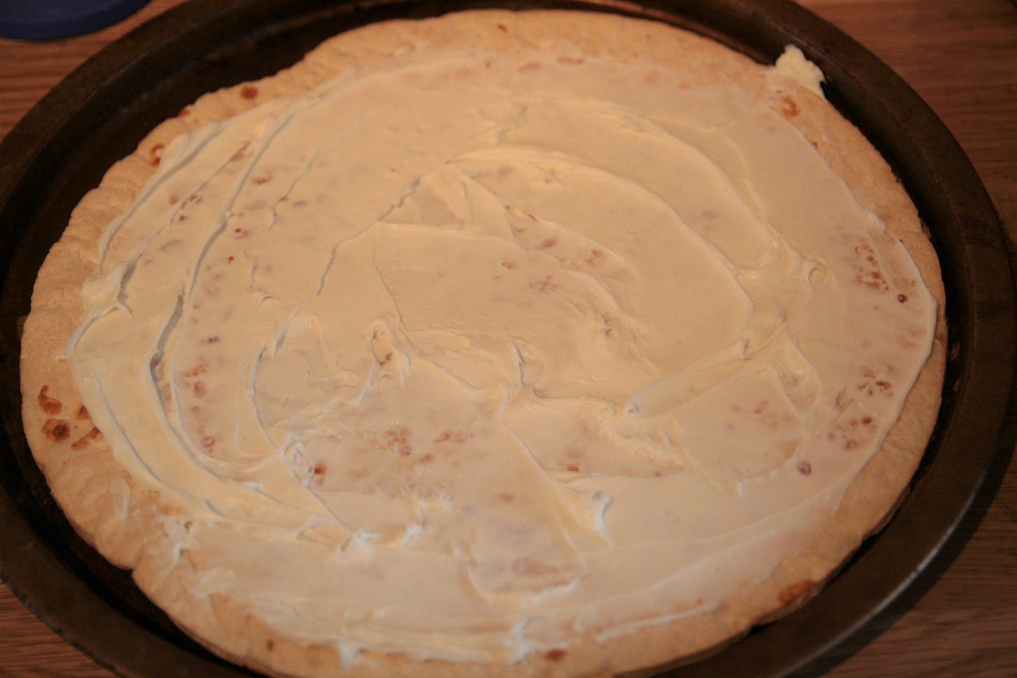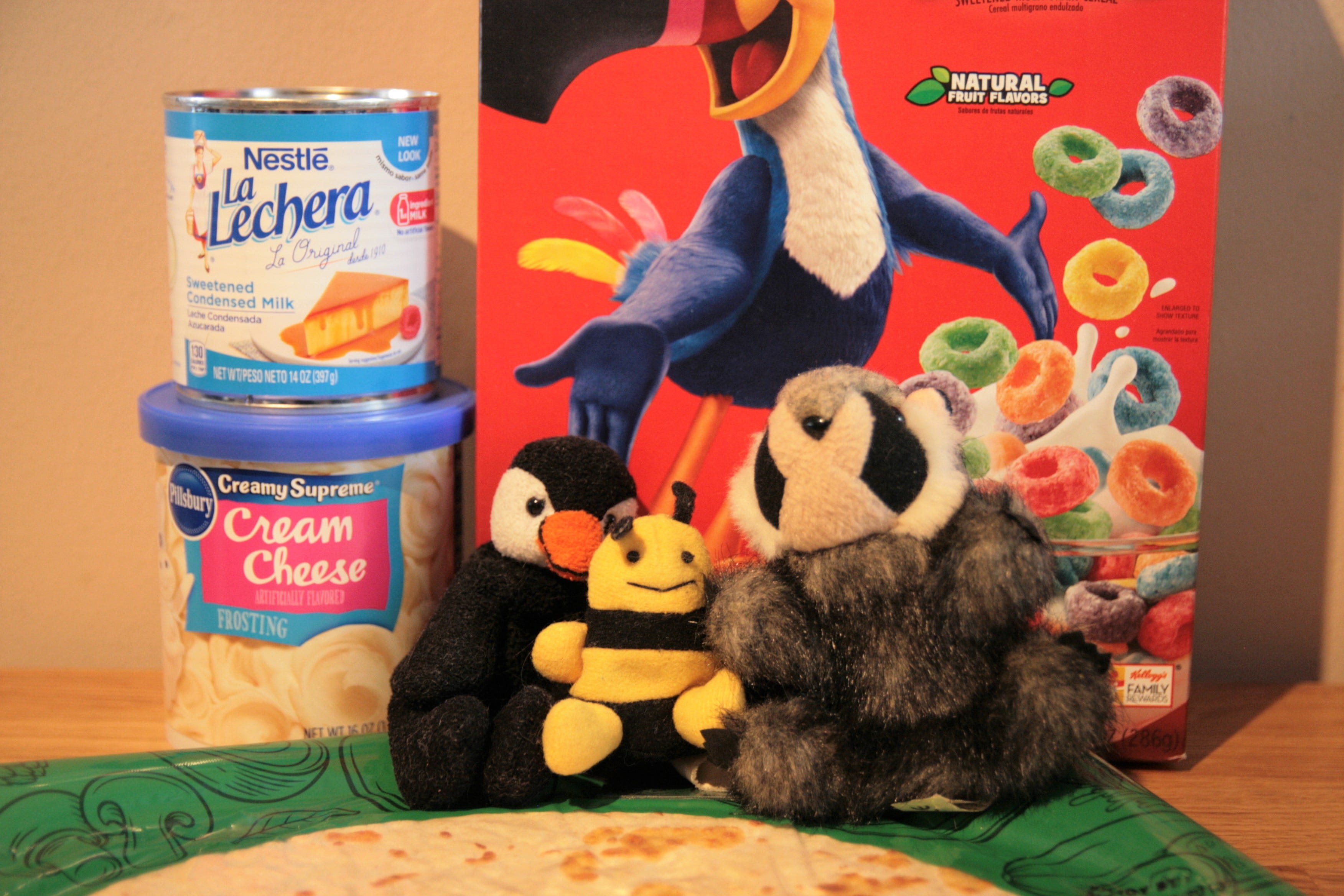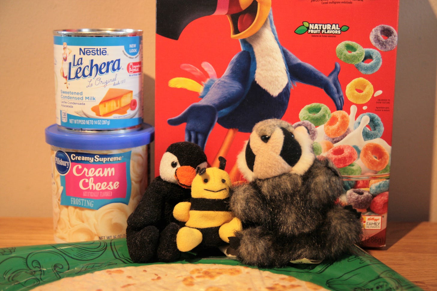 Based off of what I saw online, I decided to go with a pizza crust with cream cheese frosting, mozzarella, Froot Loops, and condensed milk to drizzle on afterwards.